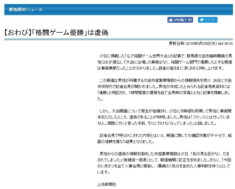 お詫び 群馬県の臨時職員が格闘ゲームの世界大会で優勝した記事は事実無根の虚偽だったことが判明 暇な人あつまれ